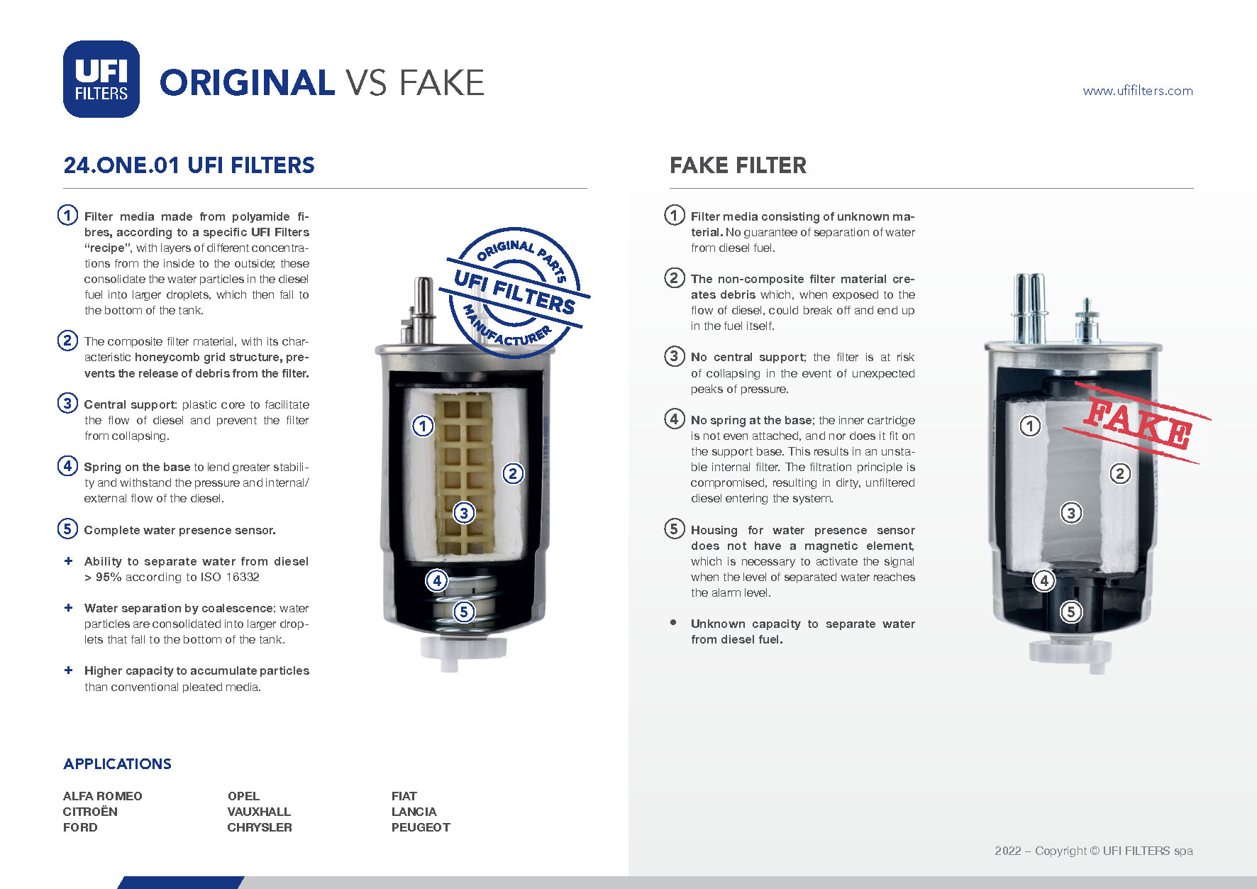 鑒于ONE產(chǎn)品系列的重要性,UFI集團準備了一份數(shù)據(jù)表,重點介紹了 UFI Filters 24.ONE.01 柴油濾清器與市面上用于阿爾法·羅密歐、克萊斯勒、雪鐵龍、菲亞特、福特、藍旗亞、歐寶、標致和沃克斯豪爾汽車的假冒濾清器之間的區(qū)別。