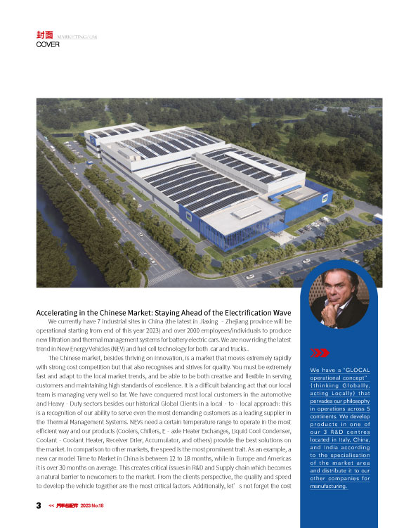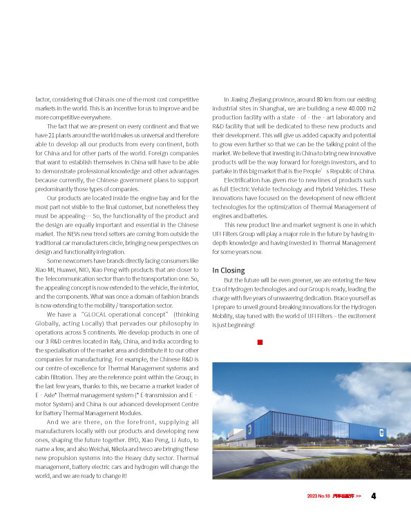目前,我們在中國擁有7個工業基地,最新的工廠位于浙江省嘉興市,預計將于2023年年底開始運營。我們現有2000多名工作人員,專注于為電動汽車生產新型的過濾和熱管理系統,以適應新能源汽車及燃料電池汽車和卡車的發展趨勢。