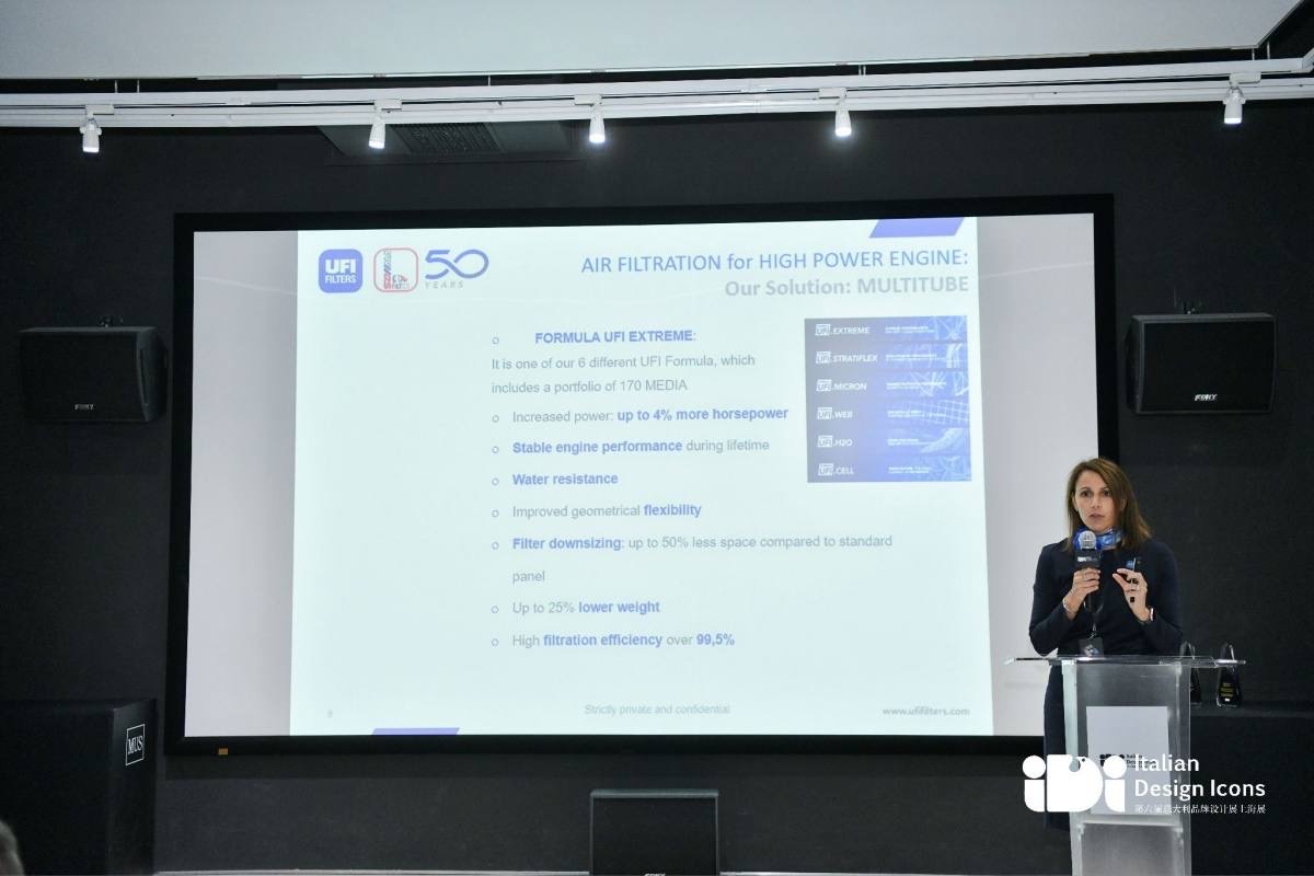 活動第二天,UFI濾清器集團亞太區項目管理主任Francesca Bonesi女士向大家介紹了集團在中國的業務發展,以及為汽車行業可持續發展所作出的努力與貢獻,除了介紹在現場展出的各種高性能、革命性的濾清器產品外,還向大家介紹了集團的秘密武器——FormulaUFI。