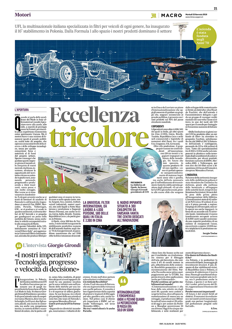 This is the identikit of UFI, initially known as “Universal Filter of Italy”, then updated to Universal Filter International, a company that produces filters for everything that moves on earth, sea and space (cars, motorbikes, vans, buses, lorries, tractors, industrial vehicles, ship engines). Headquartered in Porto Mantovano they have production sites in Nogarole Rocca (Verona), and also in China, Korea, India, Brazil, Tunisia, the Czech Republic, and within days, in Poland.